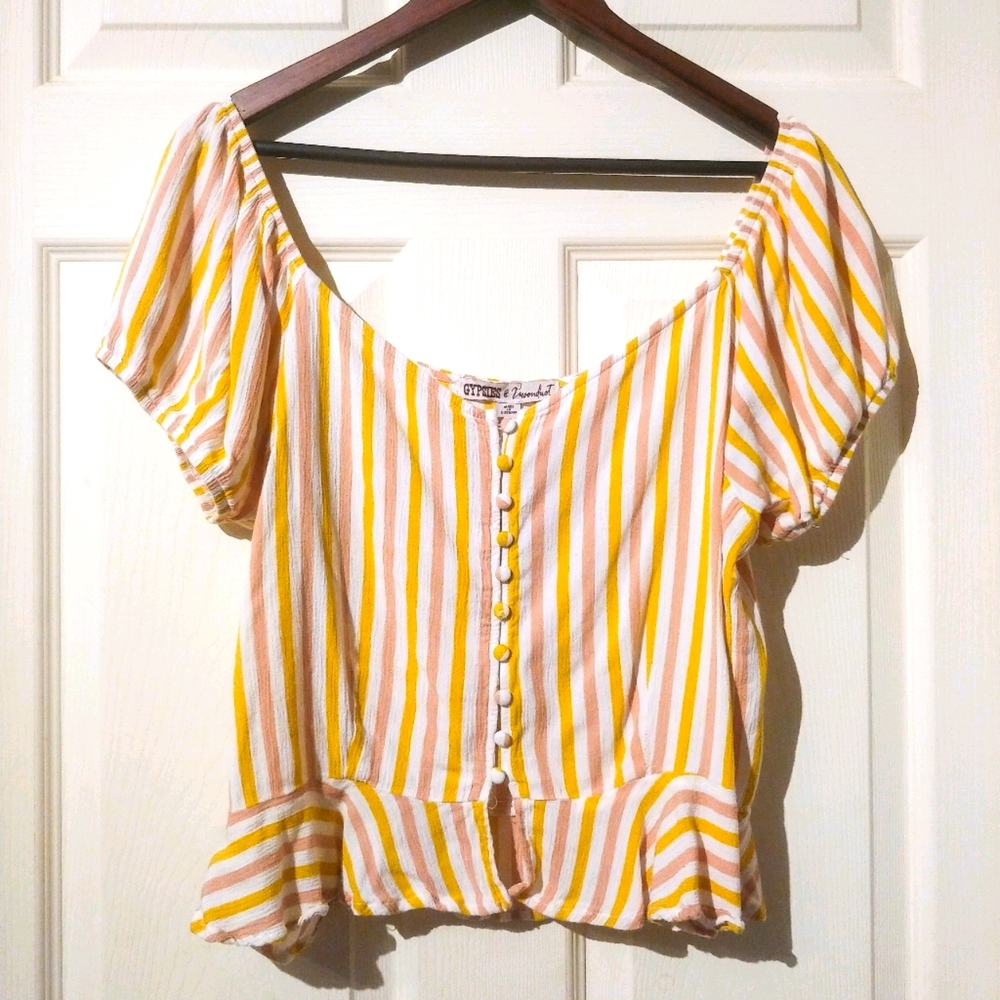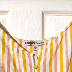 Retro multicolored crop top from gypsies & moondust. Short sleeved. Buttons down the front. Perfect for summer.