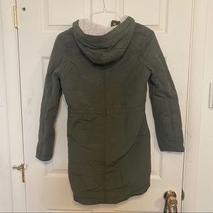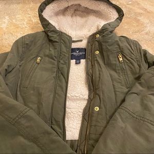Army green fur-lined zip up parka jacket with hood. Zip up pockets on both sides on the top of the jacket and two pockets at the bottom. Jacket can zip up and also has buttons to close the jacket. Size XS from American Eagle Outfitters. Keeps you very warm, and is still in great condition. Fur lining the inside of the jacket is slightly worn down.