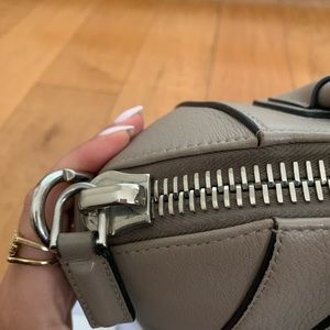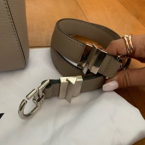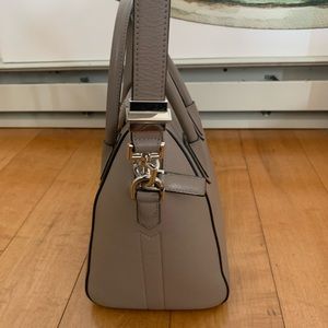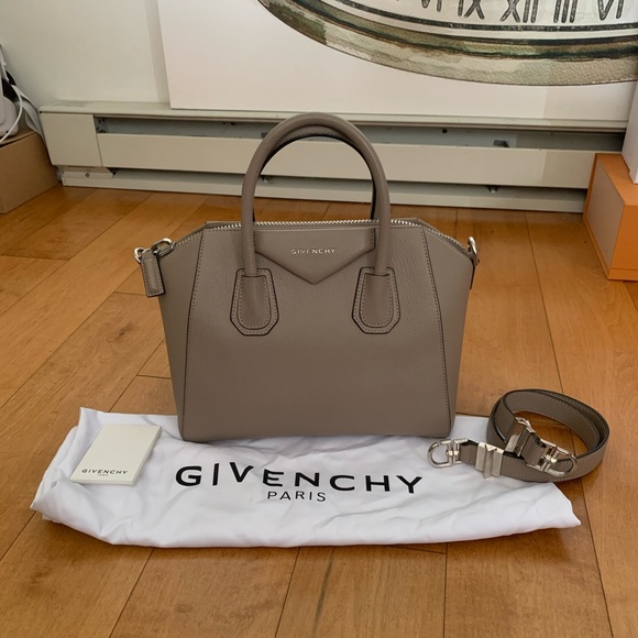 This Givenchy small Antigone bag is Givenchy’s cult classic and favorite. This is a gorgeous taupe/ dark beige that goes with everything. It’s a perfect neutral. This bag is in excellent condition! I’ve taken photos of the hardware which have barely scratched or tarnished and has been sitting in my collection for many years. This comes with the paper work, removable strap and dust cover. The measurements are D 6.7” H 9.4” W11.8” handles are 3.9”.