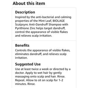 Purify for a healthy looking, clean scalp. Inspired by the anti bacterial and calming properties of the Mint Leaf, Biolage ScalpSync Anti Dandruff Shampoo with Pyrithione Zinc helps target dandruff, control the appearance of visible flakes and relieves scalp irritation.