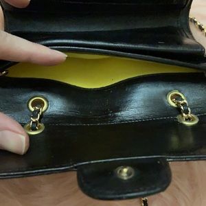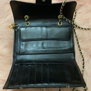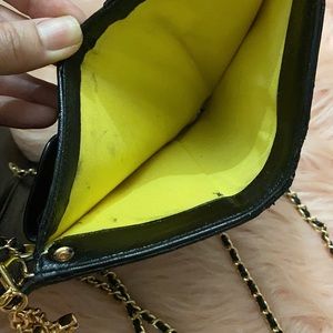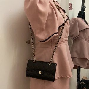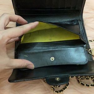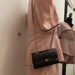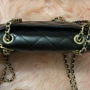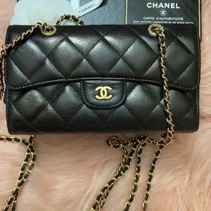 Gold and leather NON CHANEL micro-chain, double strap drop of 21 in. and gold NON CHANEL rhinestone grommets used to convert into a crossbody. Overall great condition comes with box and authenticity card.