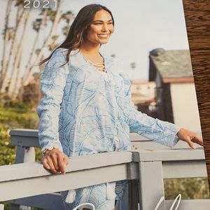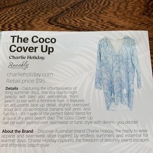 New Charlie Holiday coco Cover Up. Never worn only taken out of package for pics. Lightweight breezy cover up. Beautiful white and blue long sleeve tunic with hood and lace up neck.