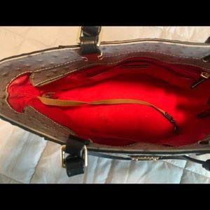 The Ostrich collection is a distinctive look with embossed calf leather and gold plated hardware.