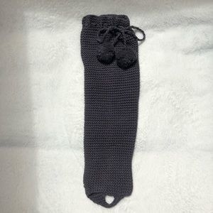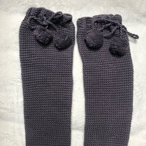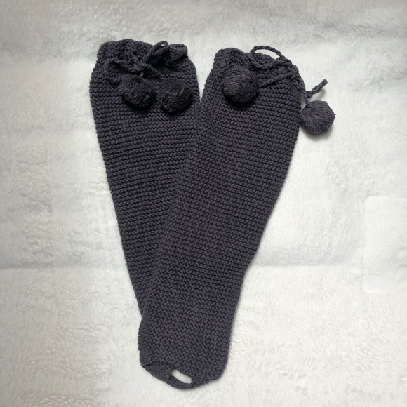 90s Y2K knitted leg warmers. They are a beautiful charcoal grey color and feature a loop that can be worn under your foot to hold them in place. The top part is also adjustable so you can tighten it around your calf