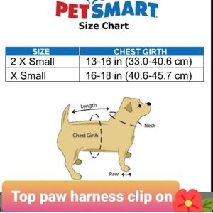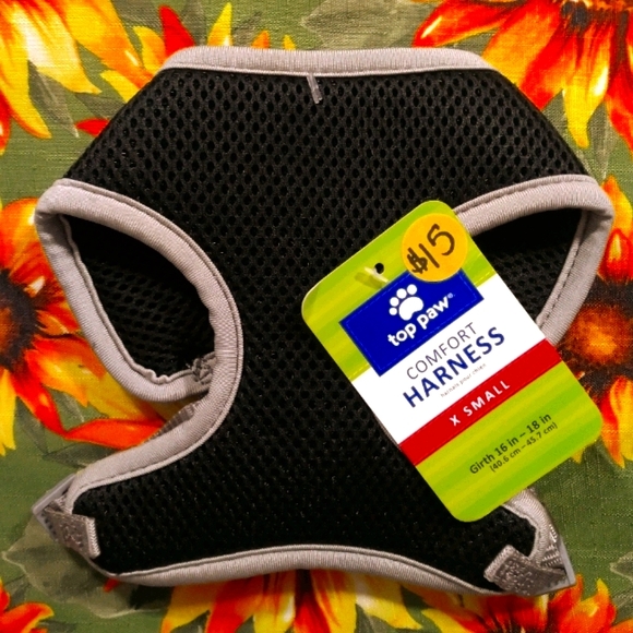 I am selling a X Small Top Paw Black and grey Mesh dog harness fits dogs girth around Chest: 16 inch. - 18 inch. Harness is light weight and material a thin breathable mesh for the comfort and air ventilation perfect for hot summer days πβπ¦Ί Please measure pup πΆ before purchasing . I can not accept returns due to covid 19 safety reasons . Feel free to let me know if you would like to bundle π Thank you again for looking
