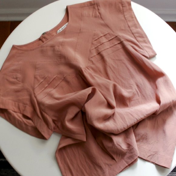 Worn fewer than five times so it's in great condition. Has been dry cleaned but is also hand-washable. Metal zipper on the back. The photo on the table is in natural light and best shows the color which is like a peachy rose.