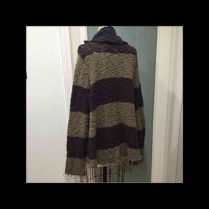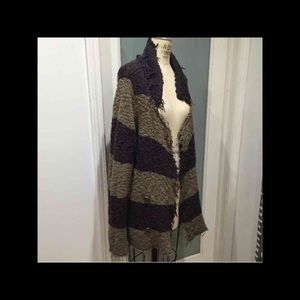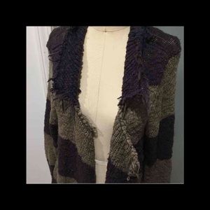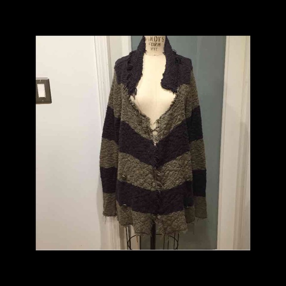 THIS IS A GORGEOUS FREE PEOPLE RAW EDGE OLIVE & NAVY SWEATER CARDIGAN. IT HAS METAL BUTTONS.