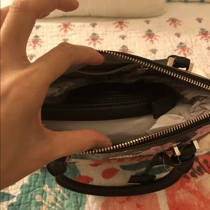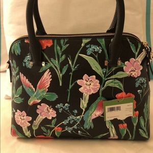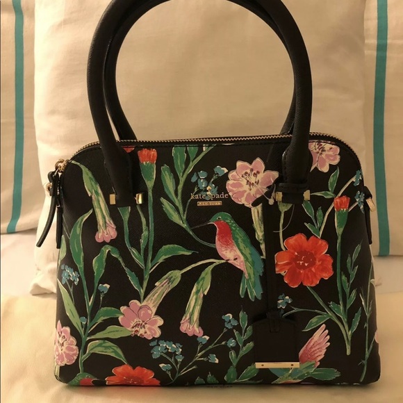 Top zip closure. Golden hardware. Brand name and spade logo.