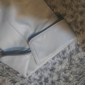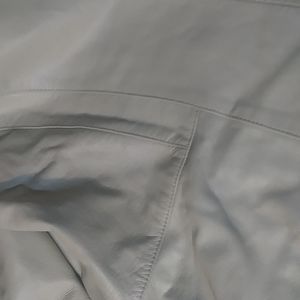 Off white leather has snap closure in front, 2 front zip pockets and 2 smaller pockets in front rolled up sleeves...100% leather...bust measures 21" waist 19" shoulder to wrist 22.5 shoulder to hip 23"...nice soft leather