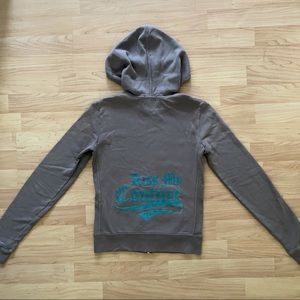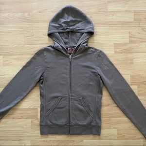 - has stretch, comfy, full zip, hooded, w/ low rise flare pants.