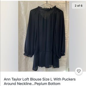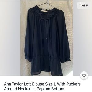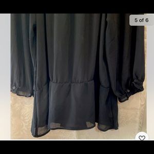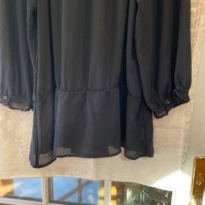 This blouse is perfect for Fall/Winter. It is Sheer so wear your favorite sparkly holiday top underneath or just a tank… endless possibilities. There are puckers around neckline and 3/4 buttons in front.Approx measurements are 26”@ from shoulder to hem… 23” armpit to armpit. Preowned in great condition.