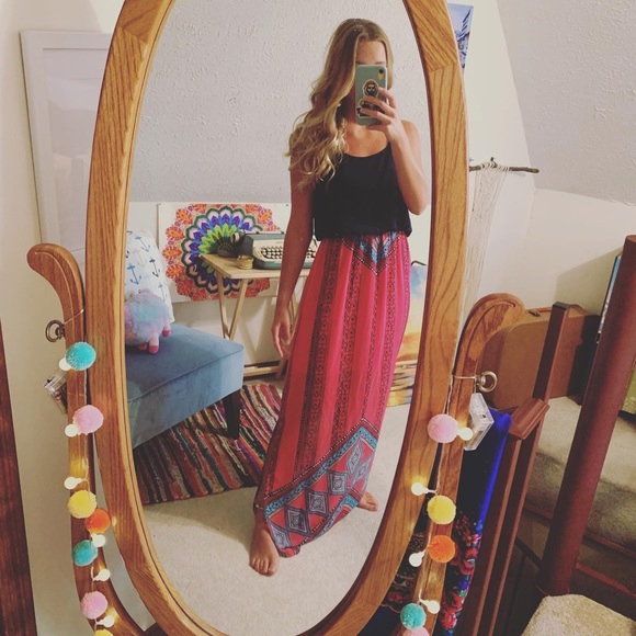Super cute maxi dress. Comfy. Minor signs of wear in skirt but not noticeable at all. Elastic waistband and would probably fit a size medium as well.
