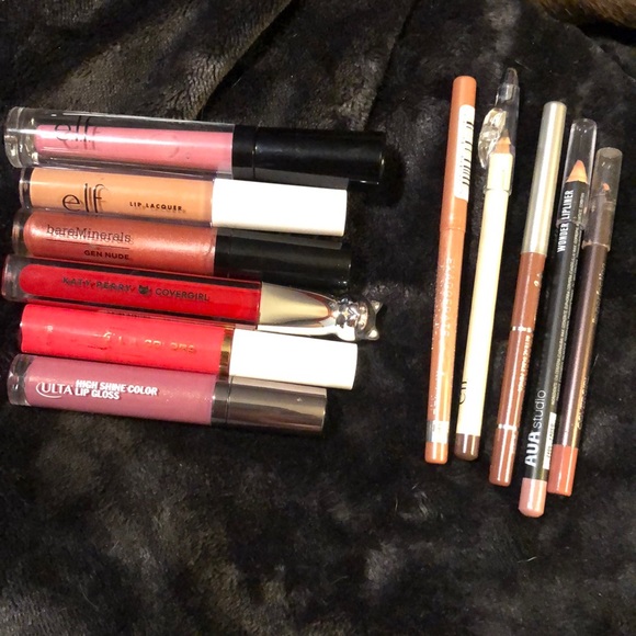 Lipgloss & lip liner bundle 💋 all have been used & santized! GLOSSES-2 ELF in shades natural & pink kiss, Katy perry cover girl in shade ninth life, ULTA high shine gloss color in shade Elizabeth, LA colors in shade fruit punch, bare minerals gen nude in shade pink diamond. LINERS- rimmel shade innocent. Elf brown, jordana rock n rose, AOA shade faded, covergirl seduce Perfect bundle for a beginner just starting out in makeup or anyone trying to grow their collection! Free gift with purchase ♥️
