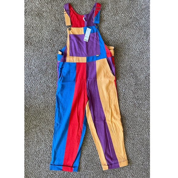 Fun funky colorful color locked overalls. 55% linen and are super duper soft. Brand new with tags from urban outfitters. There is some discoloration on the lower left pant leg, not sure what it is from but they have never been worn
