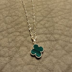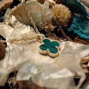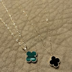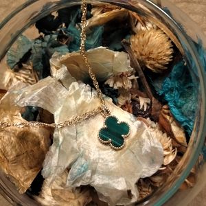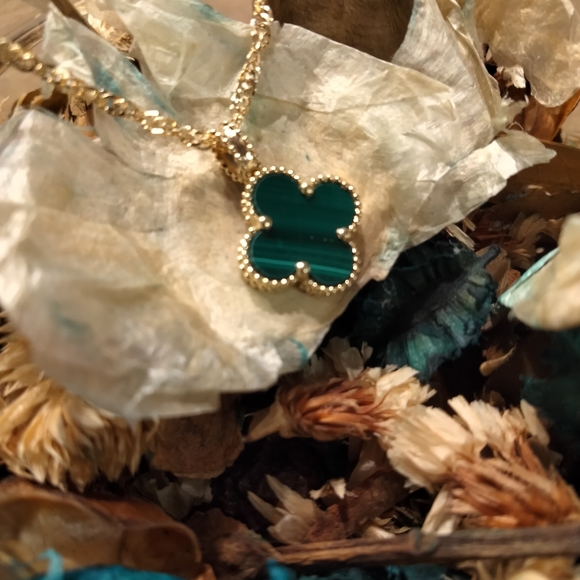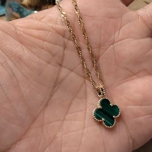 Genuine 18k gold medium malachite clover necklace, 16" delicate 18k twisted chain. Elegant necklace, very classy. I set the black agate necklace next to it to compare the size and chain difference.