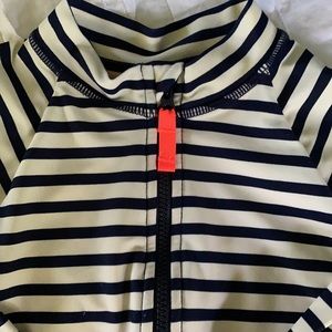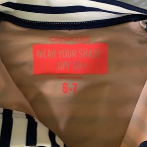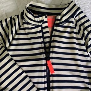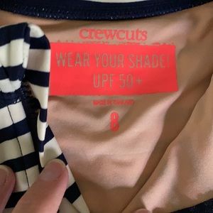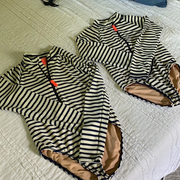 I have TWO Crewcuts Navy & Cream striped Longsleeve one piece suits. UPF 50. 🌞 They’ve been worn maybe 4-6 times. Neon orange zippers. Super cute and perfect for late summer / evening swims 🌊 I bought them matching for my daughters, both outgrown them 😢 One size 8, and one 6/7.