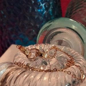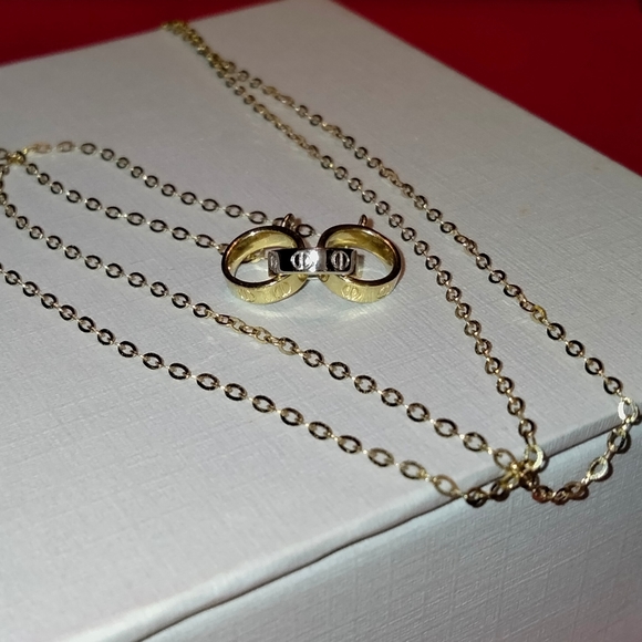 Genuine 18k gold trinity necklace with three tiny interlocking rings on a 16" chain. There are two yellow gold rings and one white gold ring, stamped 18k AU. A stunning and elegant eye-catching piece!