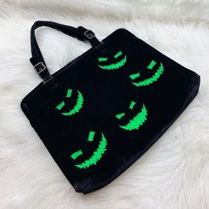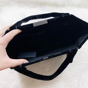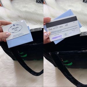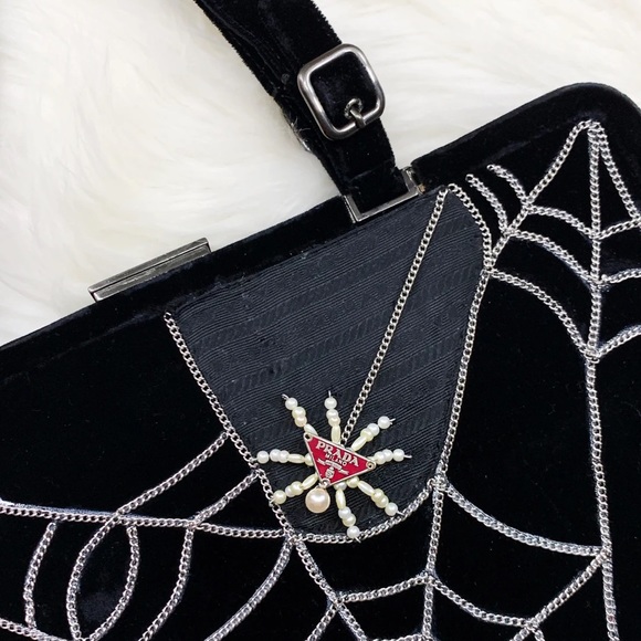 Custom Designed F/W 1997 Prada Black Velvet Spider Fright Bag • This bag is one of a kind, featuring hand sewn stainless steel curb chain web and a one of a kind hand crafted red Prada logo pearl spider on one side, and UV reactive glowing faces on the other. The bag is made in Italy, and the art was added with love in Brooklyn. The bag comes with original authenticity cards. • message me for custom orders of your own