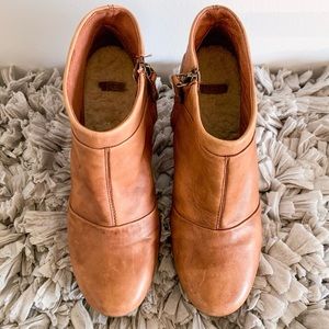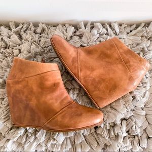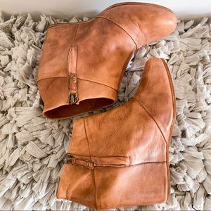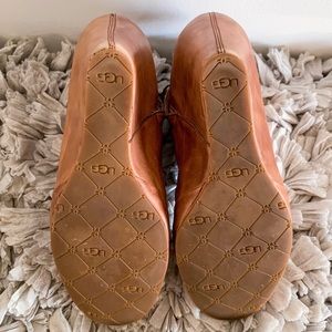 UGG Carmine Wedge Booties leather has a weathered look (made that way) and are a pretty brown. These are in good shape and have lots of wear left in them. One little water spot on the right shoe that you can see in the pictures. The shearing fluff inside the boots makes them really comfy and warm. They are a women’s size 8.