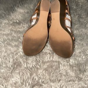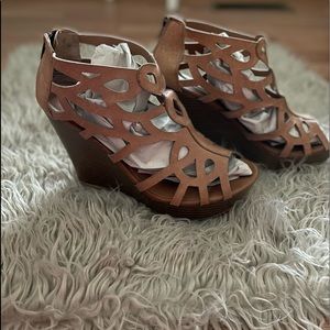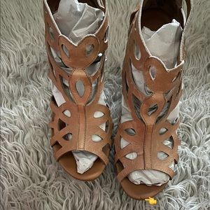 Open toe, cut-out leather, back zip. Fits nicely around the ankle