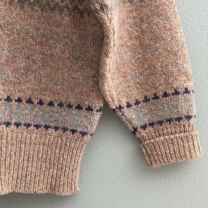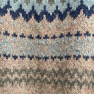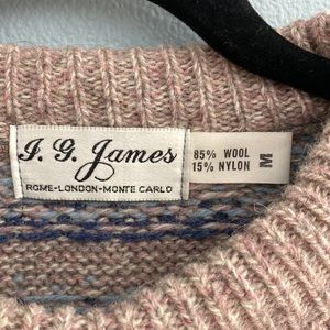 This J. G. Jones sweater is 85% wool and 15% Nylon. Itβs super warm and comfy making it a perfect winter and holiday sweater. There is a small hole near the front neck line.