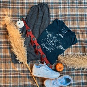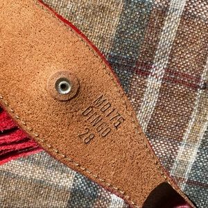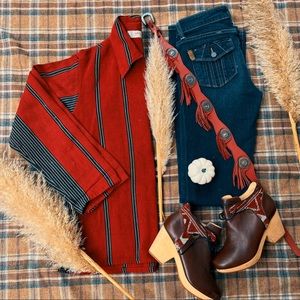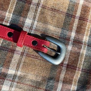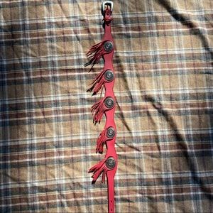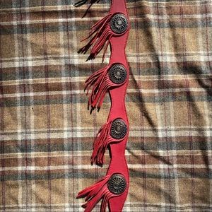 Vintage Dingo brand red leather belt with metal embellishments and fringe. Great quality, seems to be barely worn. The fringe is curled a bit because of how it was stored but that can be fixed. Marked a size 28.