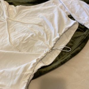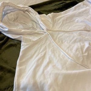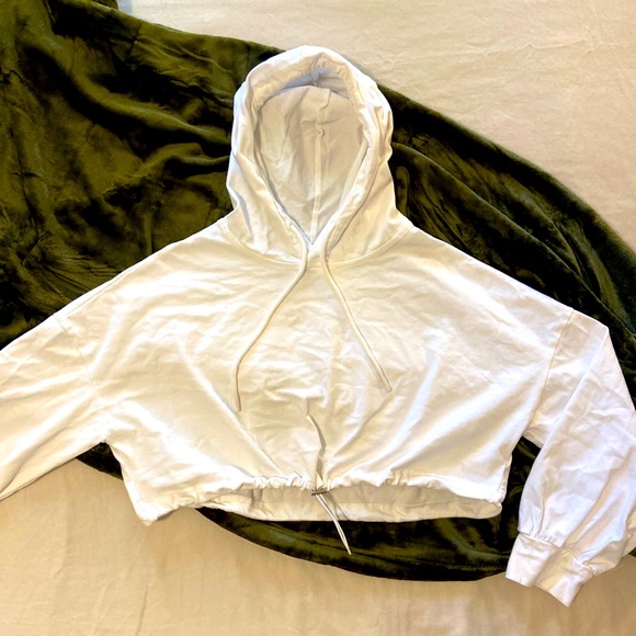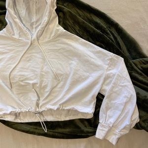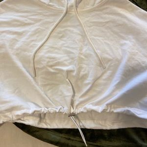 White cropped sweatshirt top. Cinch at the bottom. Soft material. Great to wear during a warmup