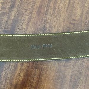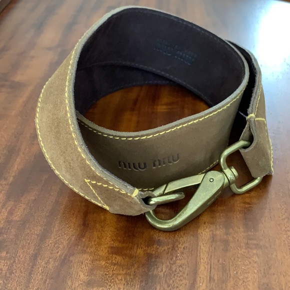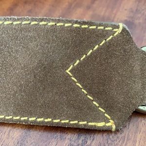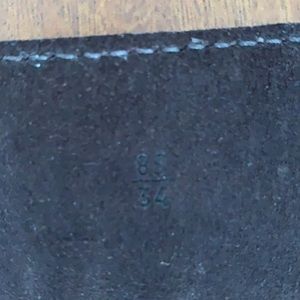 Brown suede with yellow top stitching. Hook clasp. 35”. Slight arch to cut for better contour at waist/hips. Versatile color and style. Very chic.