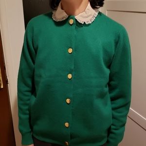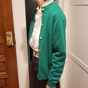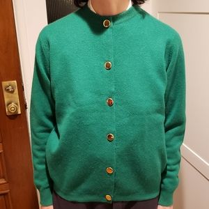 Authentic vintage bright green cardigan button-down sweater from the 50s or early 60s. Made in Scotland! Very soft and comfortable, warm 100% cashmere. Golden buttons all down the front & reinforced button holes