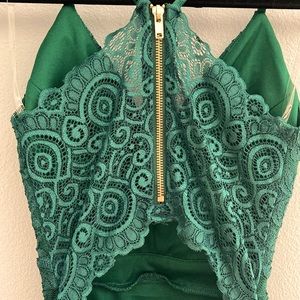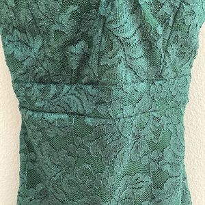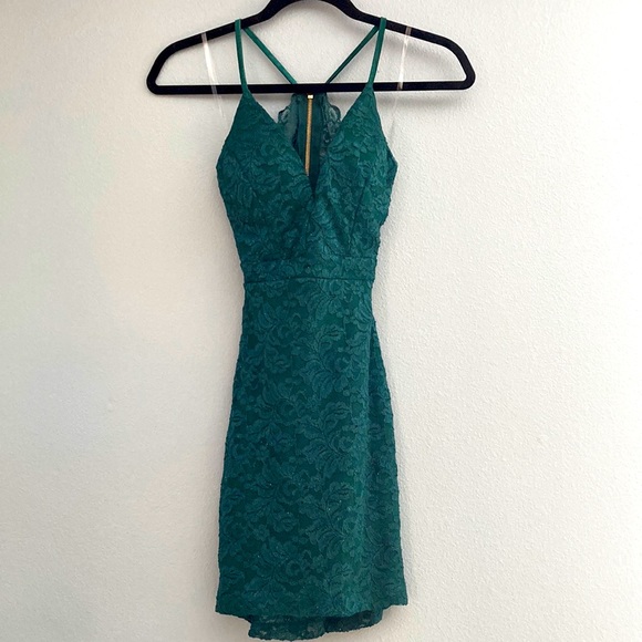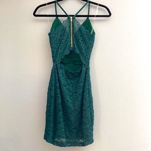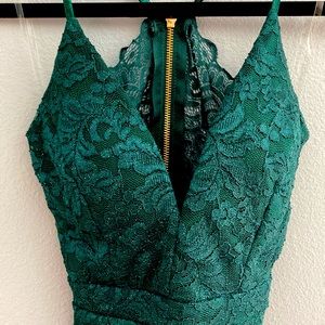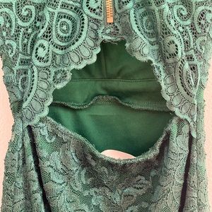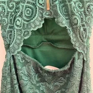 This dress is an absolutely stunning bodycon. Beautiful lace with subtle sparkle all over. The back is super playful and sexy with a zipper and see through lace detailing with a keyhole back. Padding in the bust. Perfect for the winter holiday seasons!