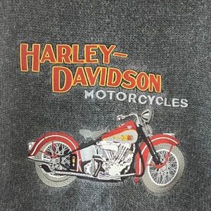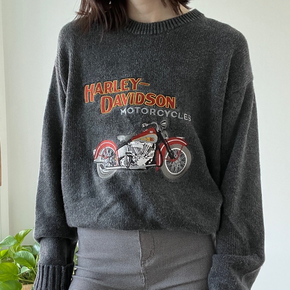 Excellent condition gray heavy knit Harley sweater. Features large embroidered patch with vintage knucklehead. Unisex. Looks great worn loose or tucked into high waisted pants. Tagged as an XL and could fit up to that depending on desired fit.