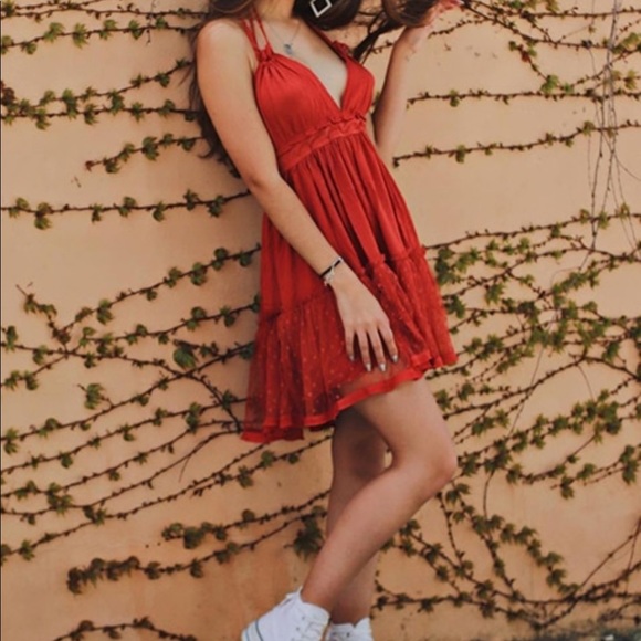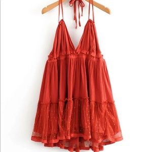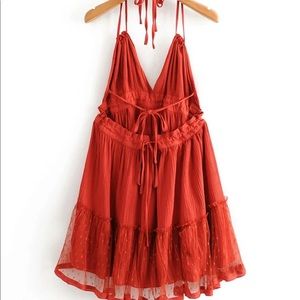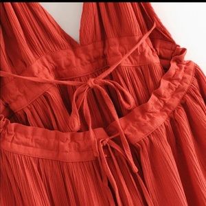 Pretty red (kind of red-orange) backless dress. Ties can tighten to fit smaller or bigger sizes. Never worn!
