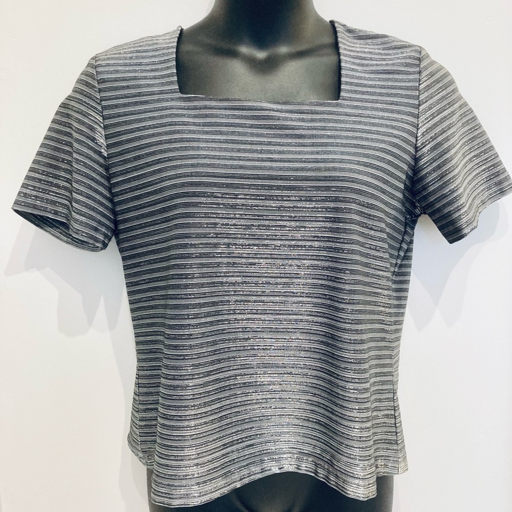 Exit Shops very sparkly grey-and-silver striped square neck blouse with short sleeves. Very flattering neckline!
