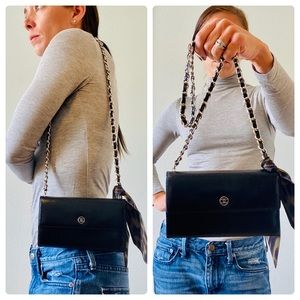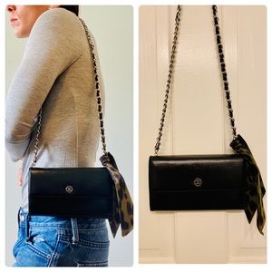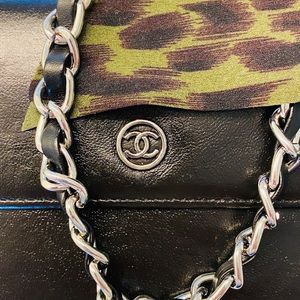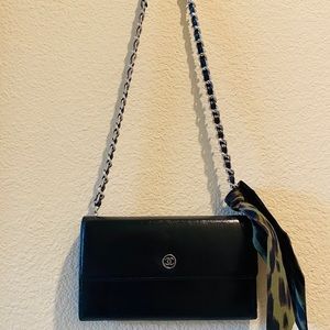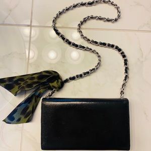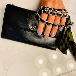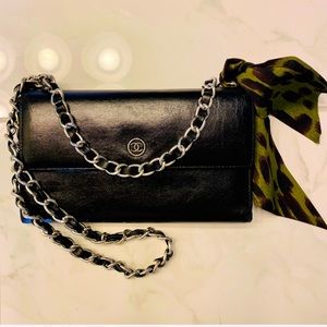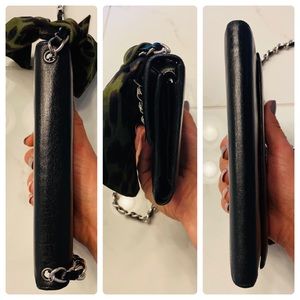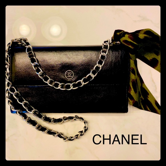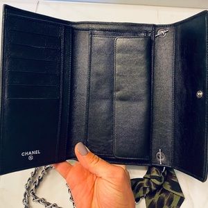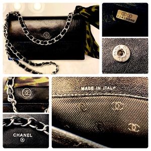 Authentic Chanel purse, a long leather wallet w/ silver chain added. This Chanel has been professionally cleaned & resealed, good as new! Inside is perfect condition black leather and CC fabric pockets. Metal Chanel CC emblem on front. GORGEOUS