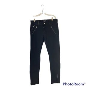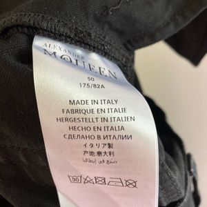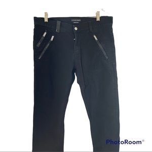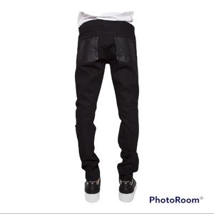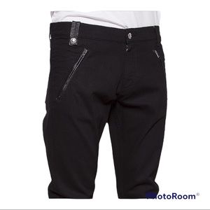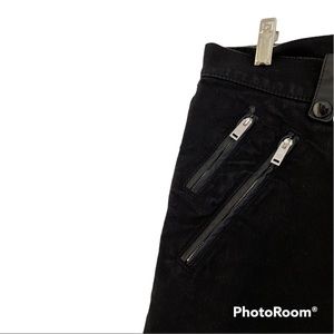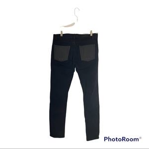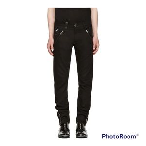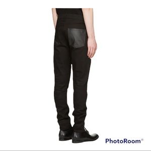 Slim-fit stretch denim jeans in black. Tonal leather trim throughout. Five-pocket styling. Eyelets at back pocket. Zippered vent at cuffs. Tonal logo embroidered at back waistband. Zip-fly. Silver-tone hardware. Tonal stitching. Approx. 7.25β³ leg opening. Body: 98% cotton, 2% elastane. Trim: 100% leather. Made in Italy. NWOT condition