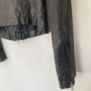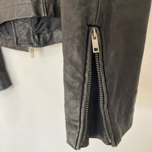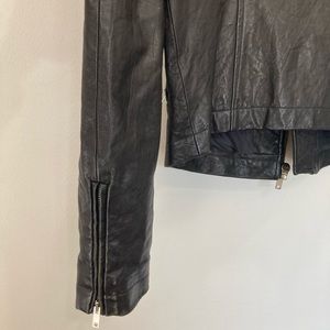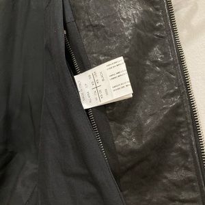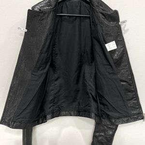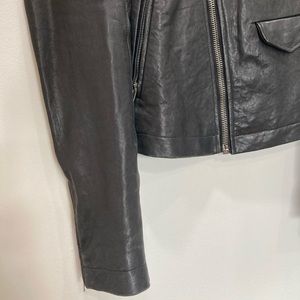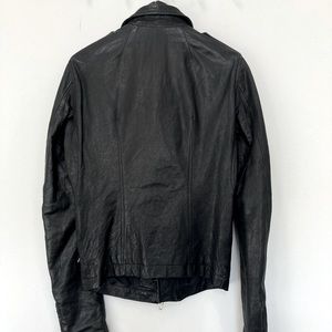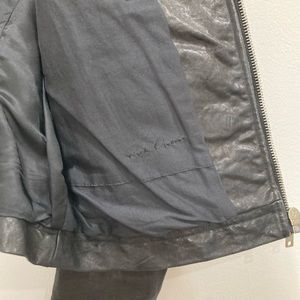 An archive piece Rick Owens Stooges rider jacket has an asymmetrical zip with three zip pockets and one button pocket.