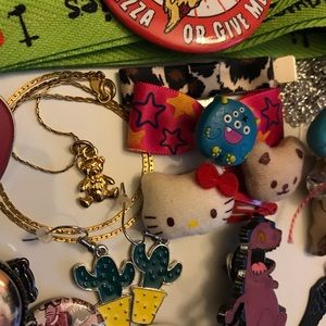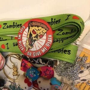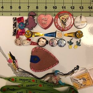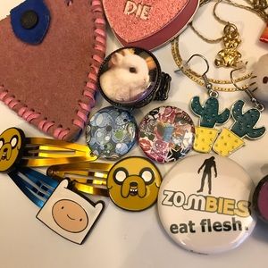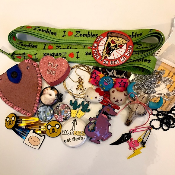 From Hot Topic: Unused “I ❤️ Zombies” lime green shoelaces, kawaii Hello Kitty plush hair clip duo, 2 Jake & 1 Finn Adventure Time cartoon hair clips, 1 leopard print ribbon hair bow, 1 scene queen hot pink star print hair bow with a cute lil monster.