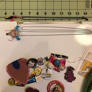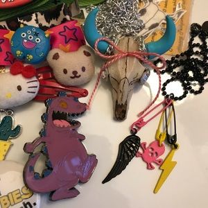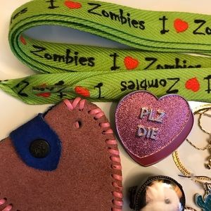 From Etsy: Give me pizza or give me death button pin by Sugarless Art, Zombies eat flesh by the pixel prince, resin longhorn steer skull necklace with a pink bow + blue clay horns + rhinestone eyes by the Confetti Monster (comes with matching temporary tattoos), ring with stretch band & three interchangeable magnetic faces (bunny rabbit, floral abstract design, & skater graffiti collage) by Magnabilities in ring size that fits 7 to 8, unworn cactus fish hook earrings, and PLZ DIE pink glitter / mauve / silver enamel pin.