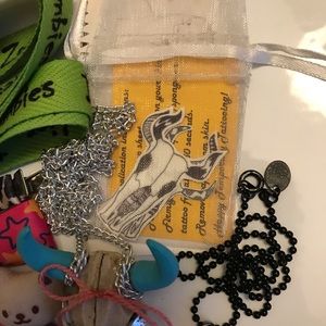 Vintage 90’s gold metal necklace with teddy bear pendant, and mauve / pink / blue / black heart shaped suede coin pouch.