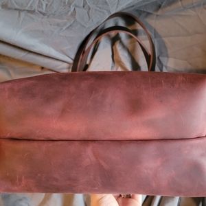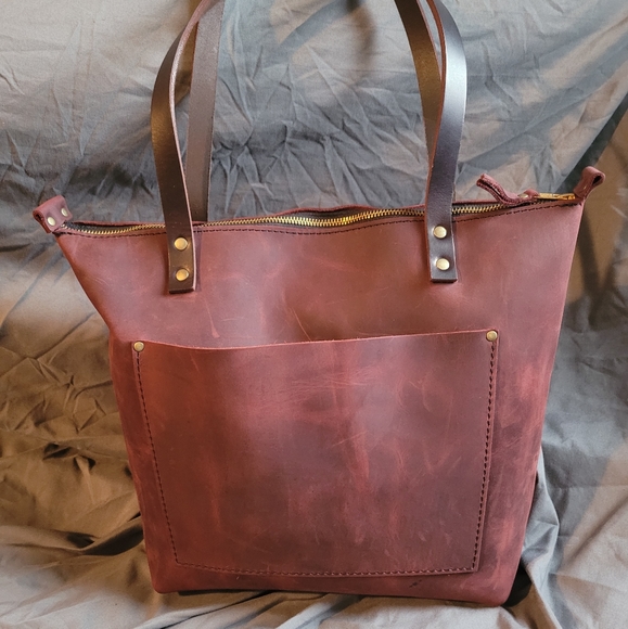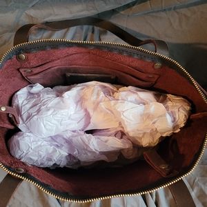 Portland Leather Goods Tote. Size medium, zipper; from their premium line - full grain, unlined. Color is Merlot. This is brand new, never carried. Has been stored in dust bag. This is the suede/nubuk leather, scratches buff out like it never happened.