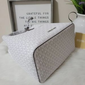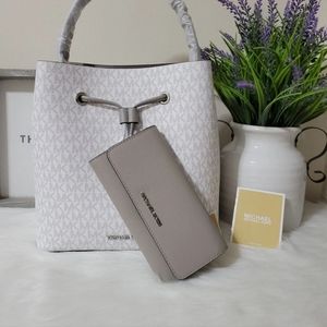 Michael Kors Suri Large bucket msgr in bright white with Large Trifold leather wallet in pearl grey. Wallet has 16 cards slot ,plus 1 for ID card