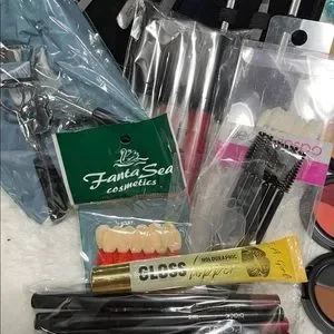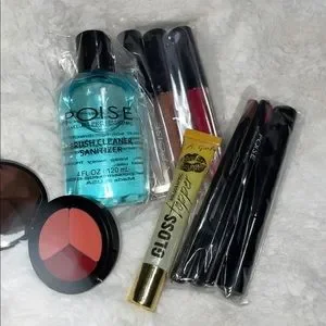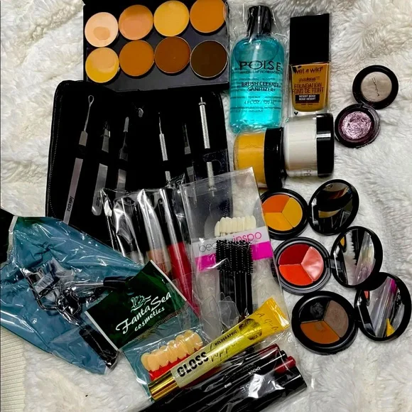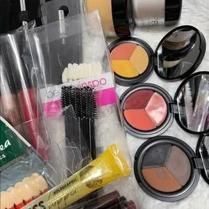 Makeup kit including, eye shadows, concealer palette, foundation, translucent and setting powders, lip sticks, lip glosses, mascara, eye lash curler, complete tweezer set, cleaner and applicators all in a clear makeup case with mixing palette. Includes everything in pictures. All brand new in packages except a few that were swatched. They were never used