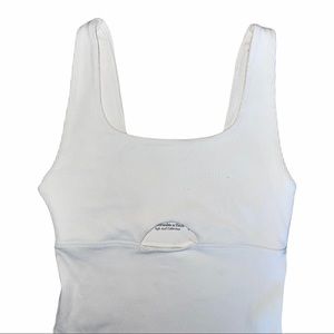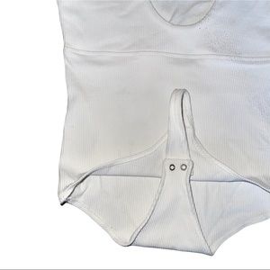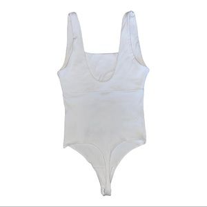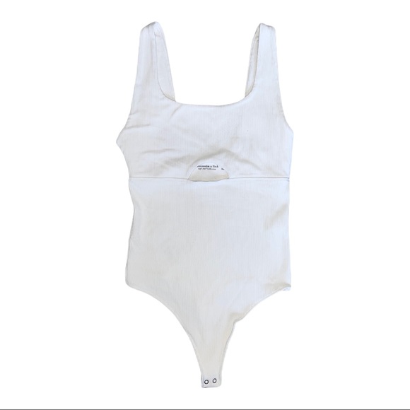 AMAZING bodysuit from Abercrombie and Fitch. Super great quality, really thick, and fits perfect. Has a cut out in the front and a low back. Bought for 50 and have only worn once! There’s slight pilling from my washer but it is unnoticeable and the body suit is perfectly white!