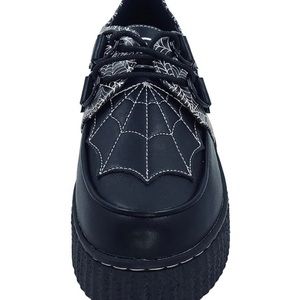 Black creeper shoe with white spiderweb repeat pattern on the sides. Back of the shoe has a black and white spiderweb cutout. Sides of the shoe have bat wing d-ring details. Top of the shoe has a black and white spiderweb cutout. Shoe has black waxed cotton round laces.