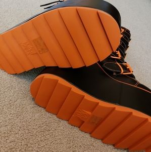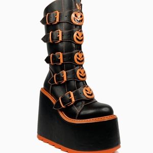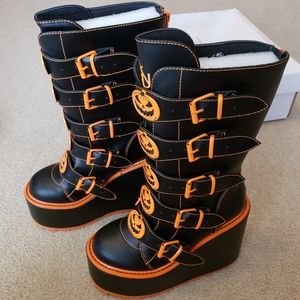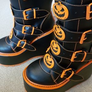 Brand is YRU, the style of boot is Dune, and these are the Jackolantern design in black and orange. The platform itself is hefty and sturdy, this is not a lightweight boot. It has approximately a 6 inch heel height.