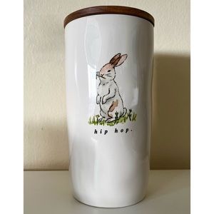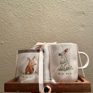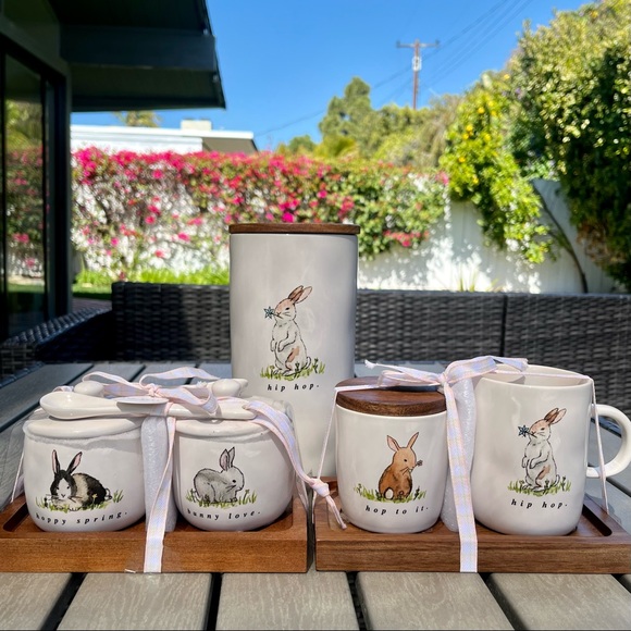 Rae Dunn “hip hop” bunny cellar, “hoppy spring” & “bunny love” condiment jars, and “hip hop” & “hop to it” mug set. Beautiful watercolor designs from her Easter 2022 collection. All NWT.