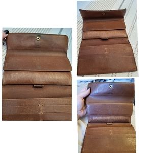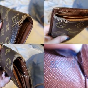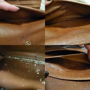 Outside monogrammed leather in good shape, inside leather worn and a bit discolored, peeling & stickiness in the card slot pockets, peeling in coin pocket, pulls and damage around lining of wallet