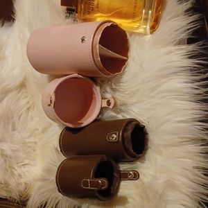 selling 2 makeup brush holders to put ur clean brushes in .to cover them from dust.used but pretty good shape and care. THIS PRICE IS JUST FOR THE MAKEUP BRUSH HOLDERS !!!