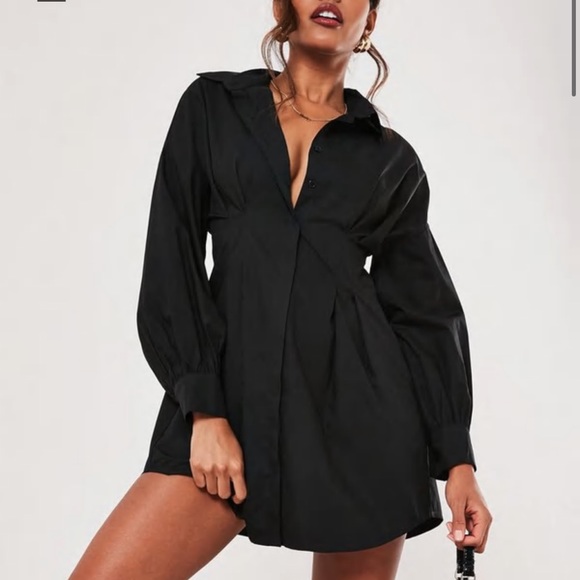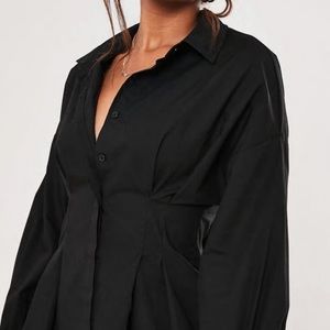 Super chic black shirt dress in a poplin fabric with pleated waist detail and concealed button front fastening. Button at the cuff of sleeve.