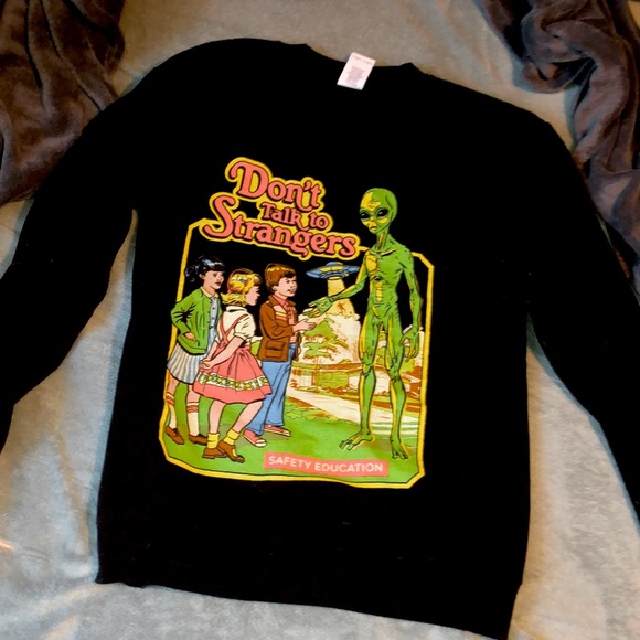 This ironic alien sweater is sure to spark some interesting convos ;) also this pull over sweater is SO SOFT on the inside, super cozy! I have only worn a couple times so in like-new condition, color isn’t faded at all, super dark black! My friend might want to buy this so if your interested then don’t hesitate before it’s too late! Size small but loose cozy fitting, I would say it is true to size! Could fit a medium or XS easily 👽 (not actually Zumiez but fits the vibe! From Wicked Clothes)